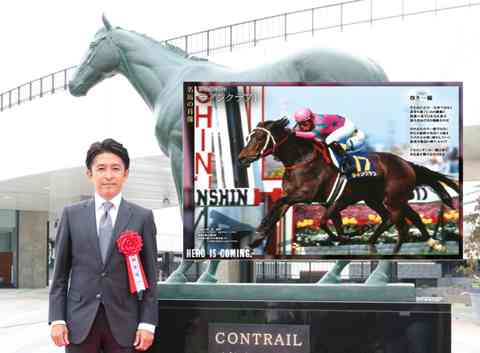京都競馬場 リニューアルオープンでの「コントレイル号」モニュメント 2枠 3番(菊花賞時の優勝馬番:像には馬番はありません)