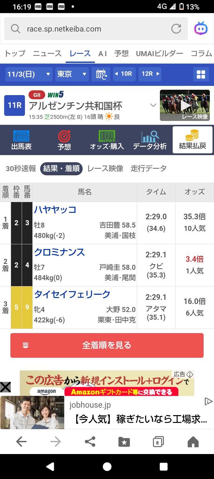 菜さん、アルゼンチン共和国杯的中おめでとうございます!!!