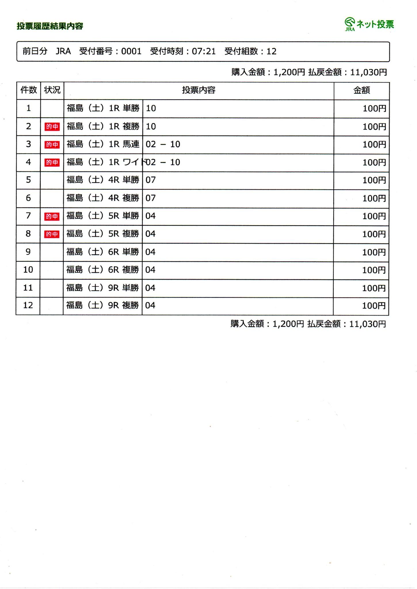寝ぼけたじじいさん、福島1R馬連1点的中おめでとうございます。