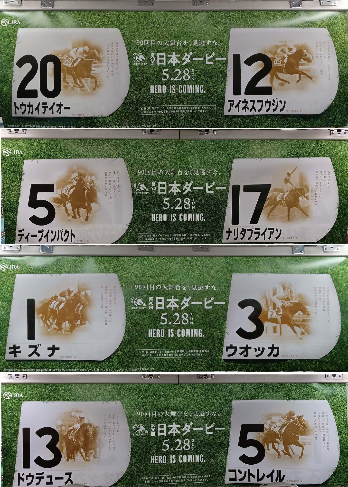 東京優駿で中吊りとホーム両方に名前があるのは13番ドゥデュースと5番コントレイルの2頭。
