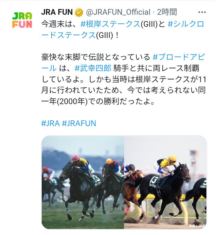 今週のJRA FUNではブロードアピールが取り上げられてました。同一年にシルクロードSと根岸Sを勝ったことが記載されてますがどちらも⑬番で武幸四郎