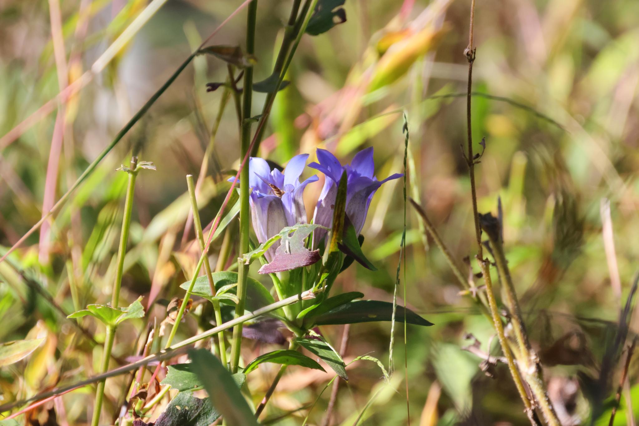 もしかして潮見の森にアサギマダラが来ていないかなと昼休みに行ってみた。期待もむなしく空振り三振、しかたなく「イノシシ」に荒らされてボコボコになった旧薬草園へいってみた。荒れ果てた中にリンドウがひっそりと咲いていた。なにやら潜り込んでいるぞ。