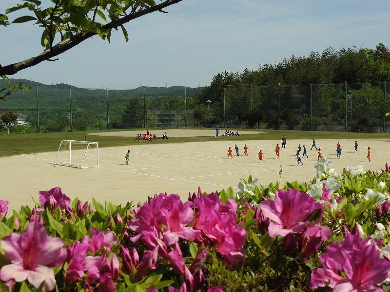 サツキの花に囲まれて、少年サッカー試合が