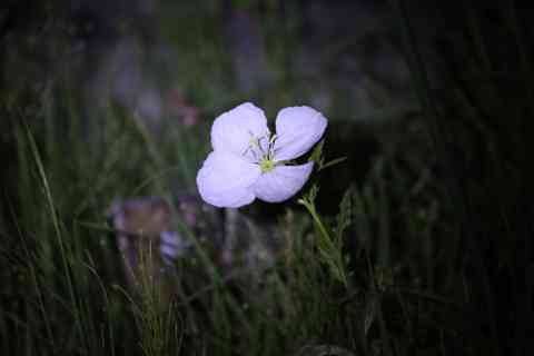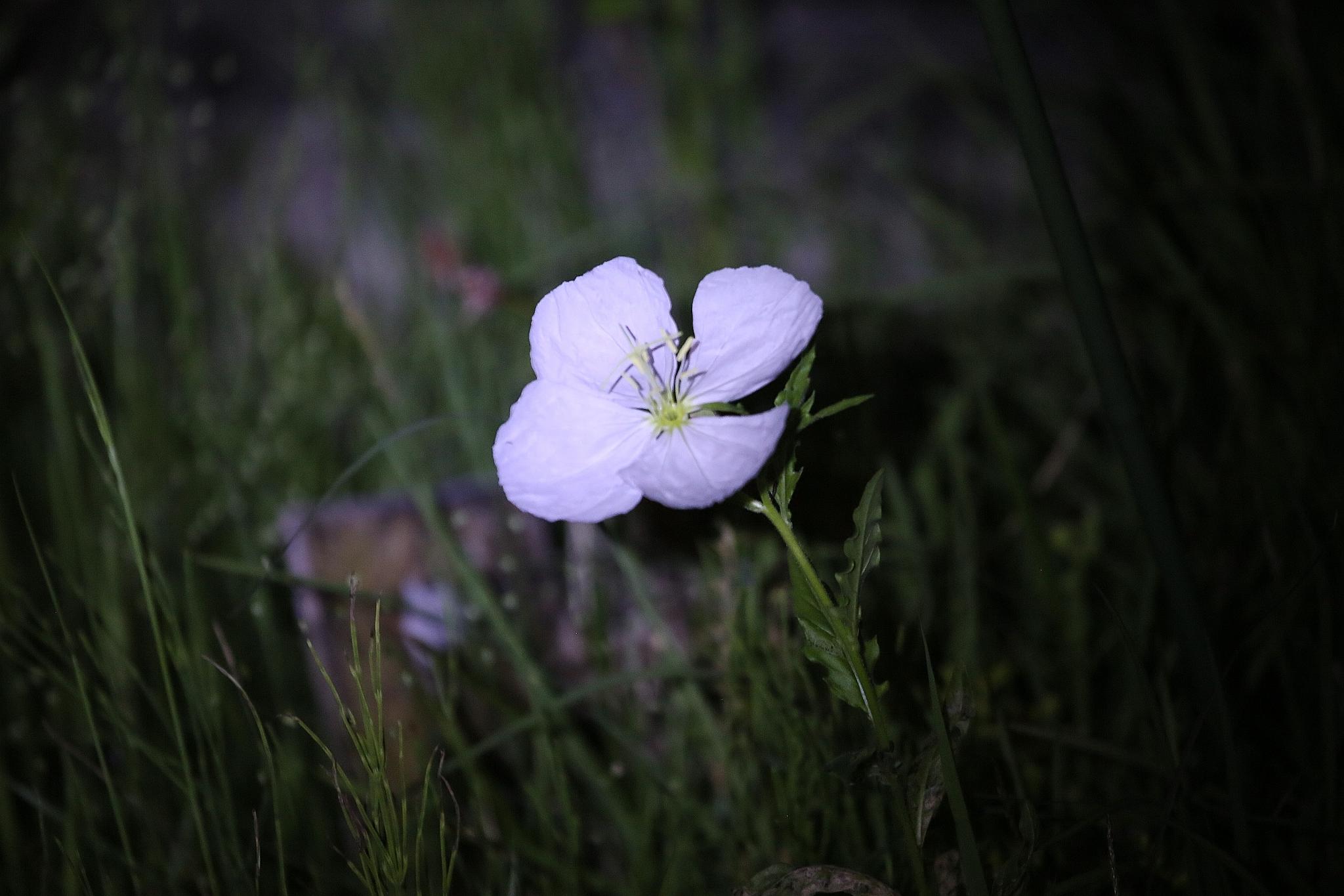 暗闇の中に白い4枚の花弁を広げた月見草が見られました。