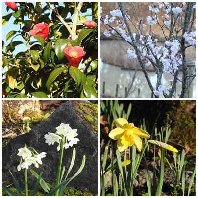 水仙や椿、そして桜の開花です。公園の枝垂れ桜