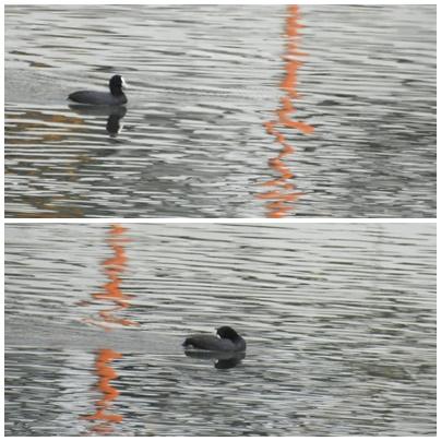 土岐川でオオバンが川面の赤い線のゴールを目指して
