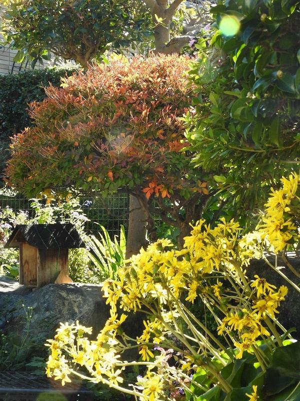 黄色の花のツワブキの向こうには、紅葉した