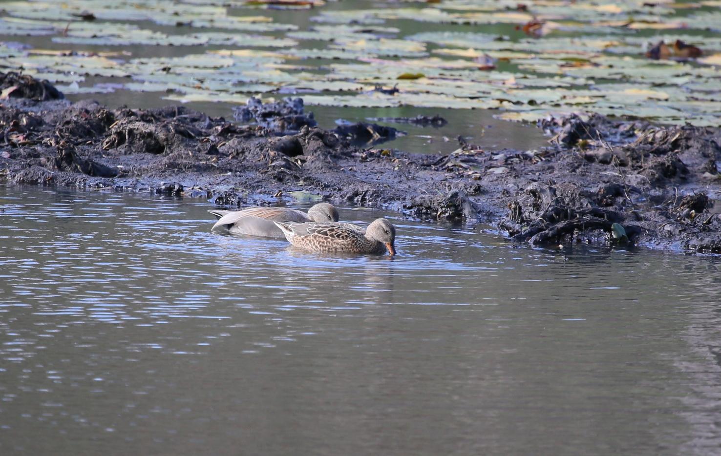 睡蓮がヘドロと化した池にも、数種類の水鳥が越冬するために来ています。