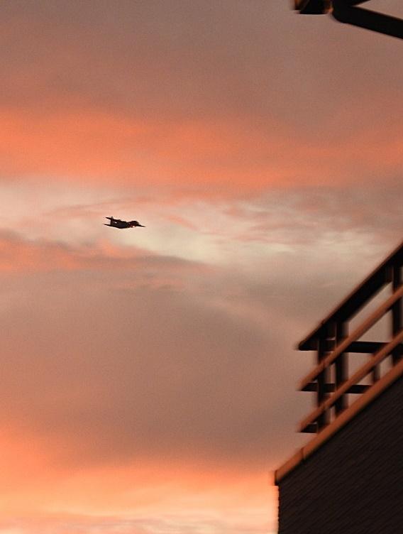 真っ赤に燃えた夕焼けの中を、飛行機が飛んでいました。