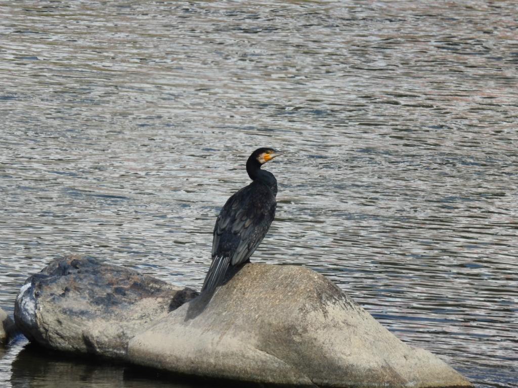 土岐川の石の上にカワウが時折止まって、