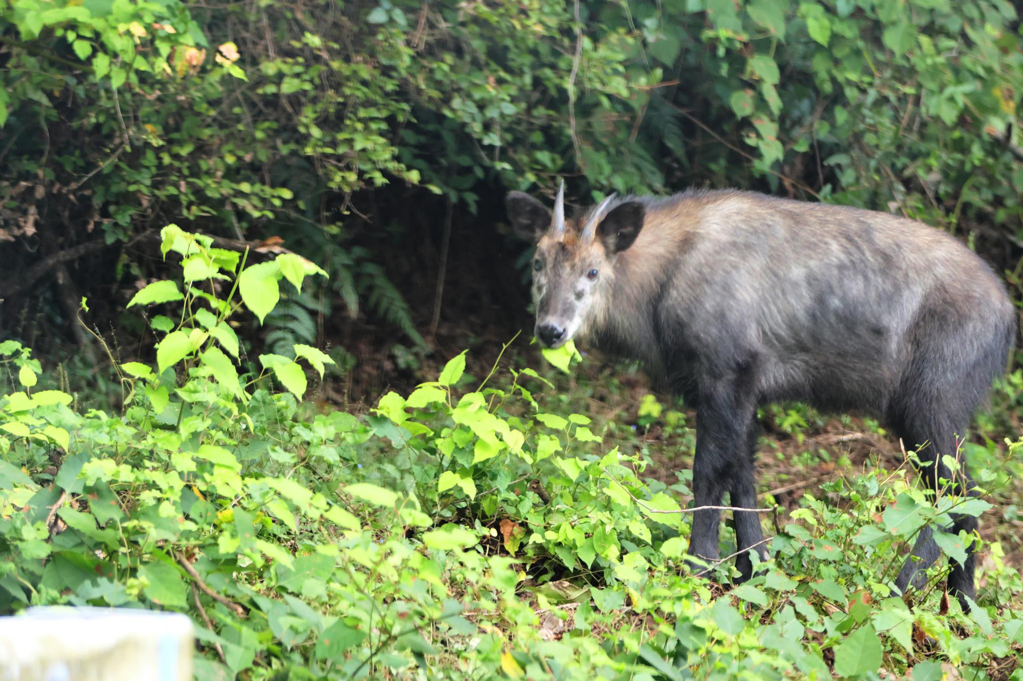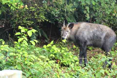 連チャンですみません。ホトトギスを撮影後山を下っていたらカモシカがいました。距離にして4~5メートル向こうは不思議そうな顔をしながら草をむしゃむしゃと食べていました。車から降りると逃げるので車中から撮りました。かなり大きなカモシカでした。
