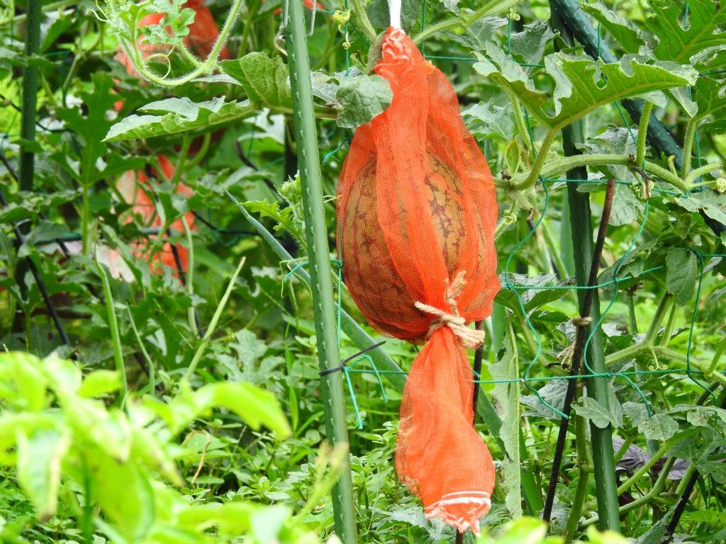 今年も網の中に入れた小さな西瓜が沢山生っていました。