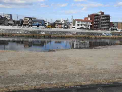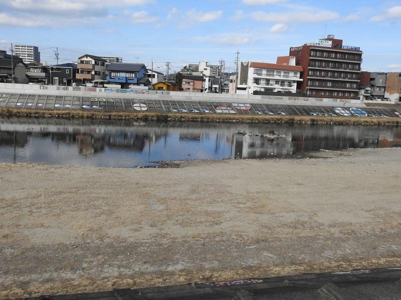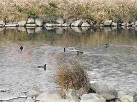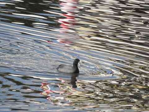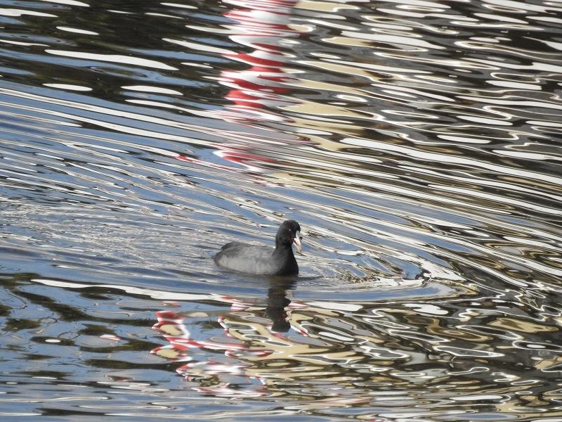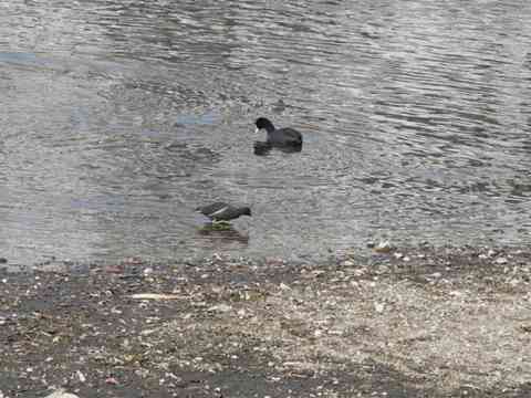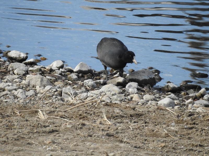 オオバンが多治見橋下流南側の岸辺に上がって、