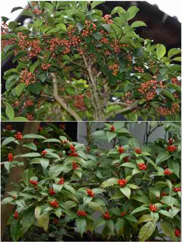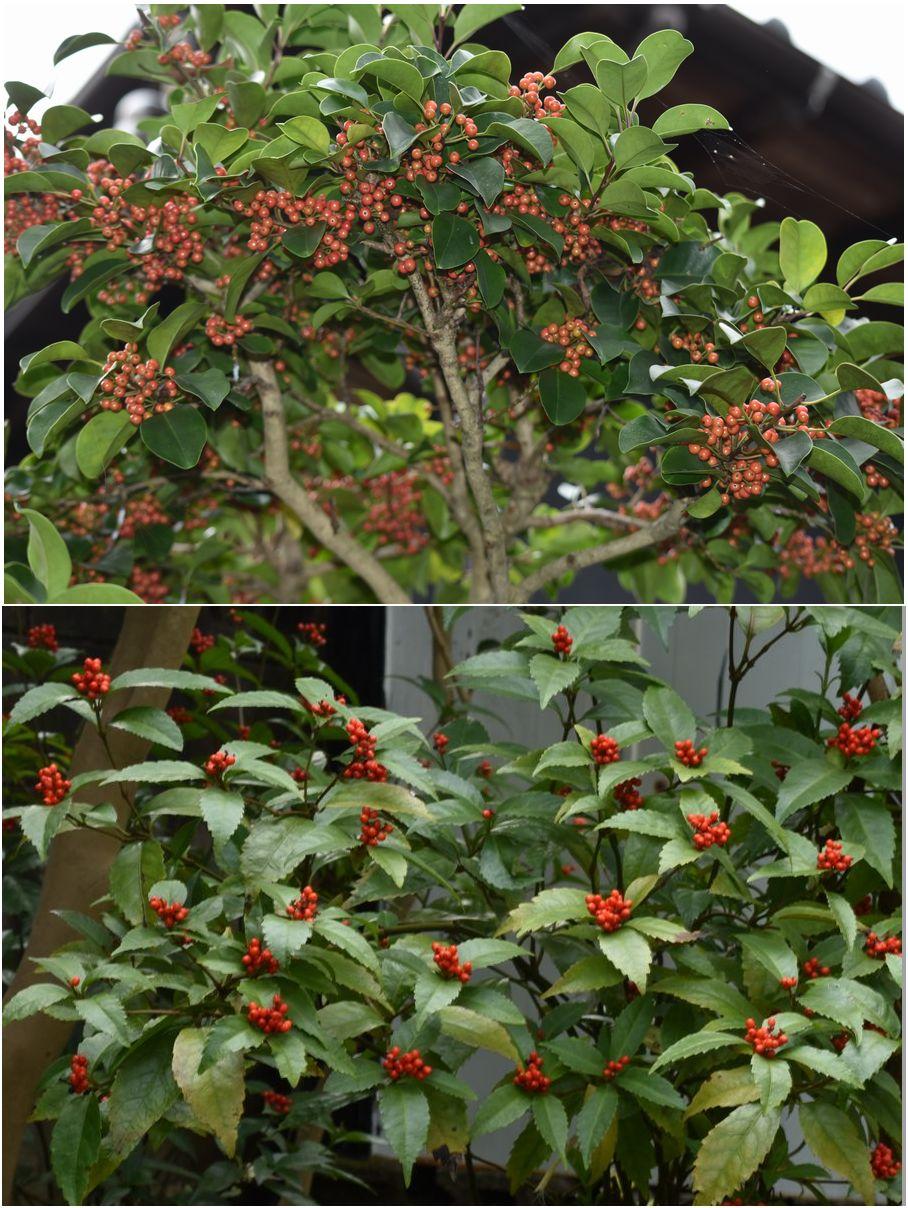 モチノキやクロガネモチの実が赤くなり、庭が美しく