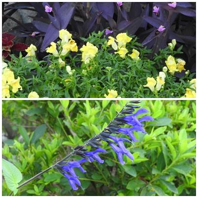 7月8日、黄色の金魚草と青色のメドウセイジが奇麗です。