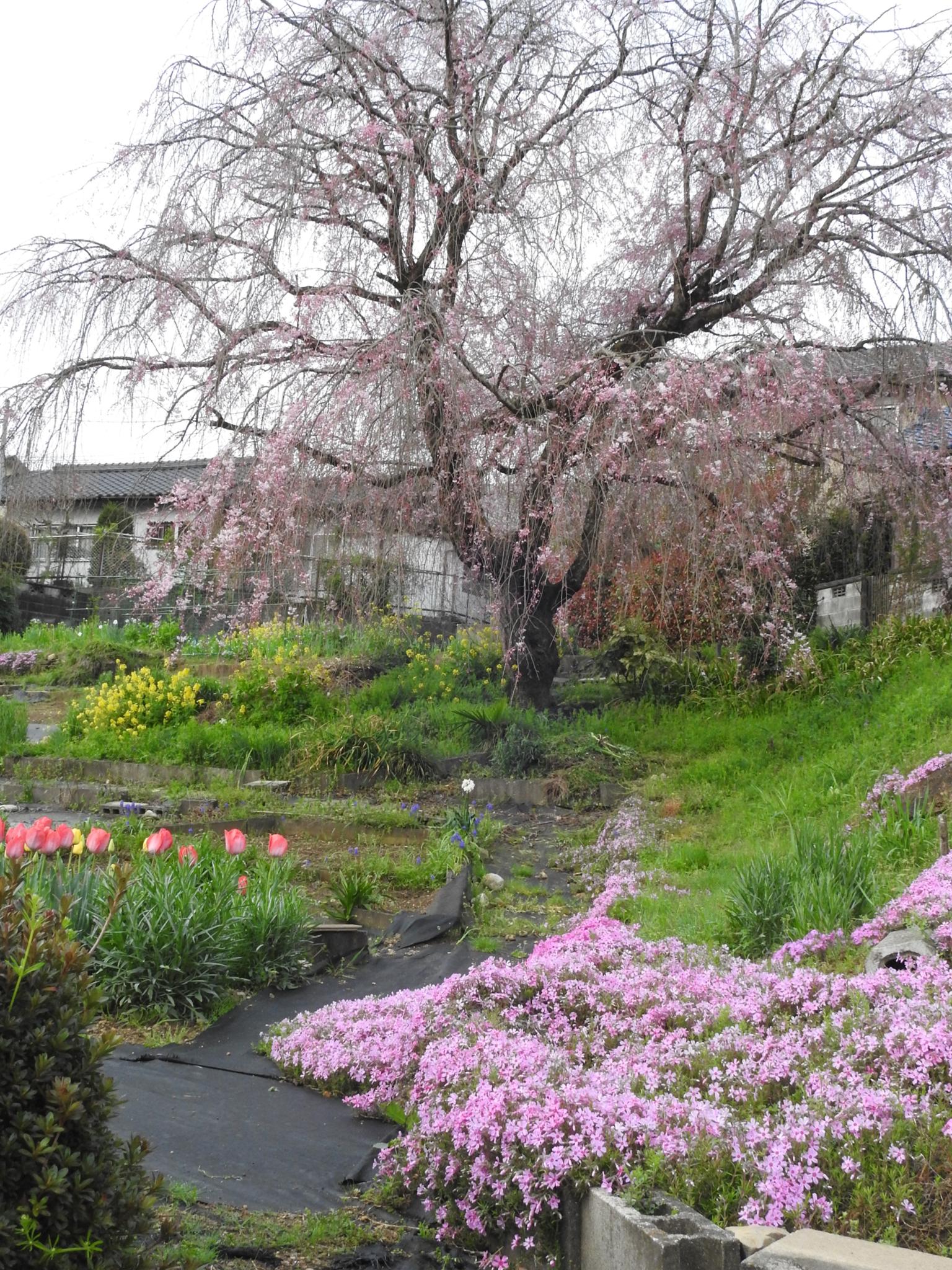花の下に植えて有る芝桜やチュウリップ、そして菜の花