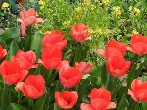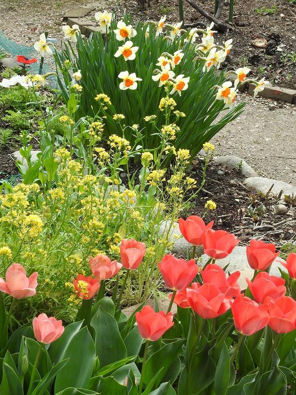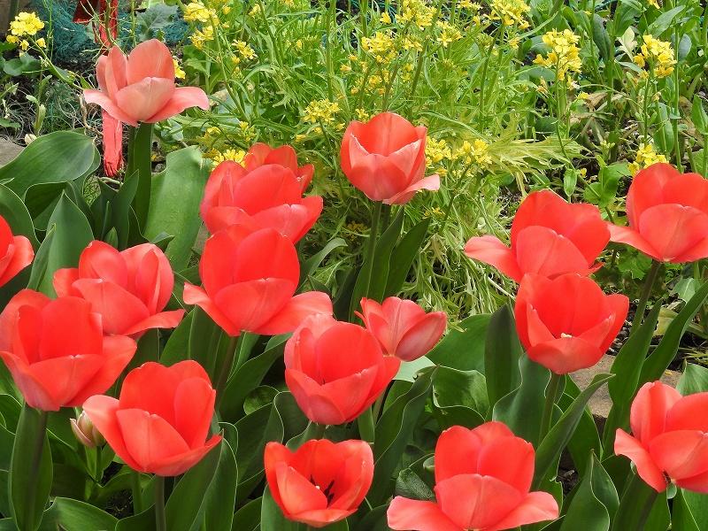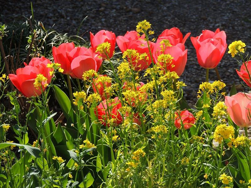 菜の花の黄色とチュウリップの赤色が、お互いを