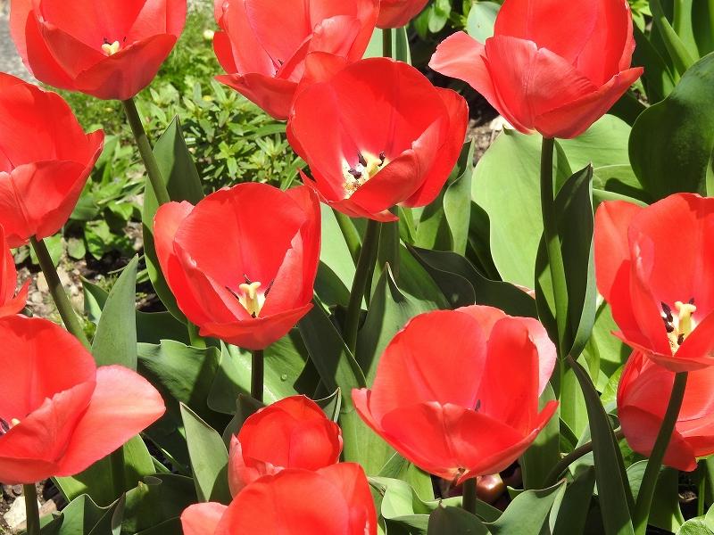 奇麗な赤色のチュウリップと、黄色の葉の花、