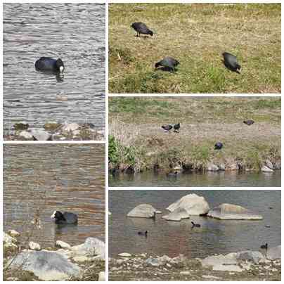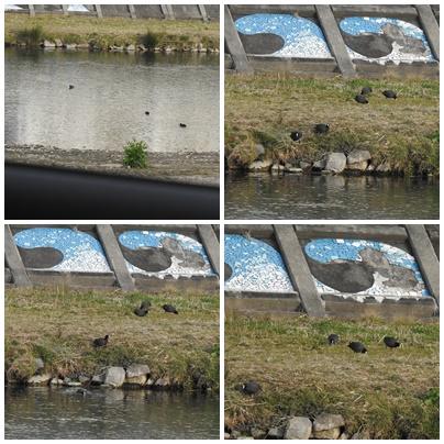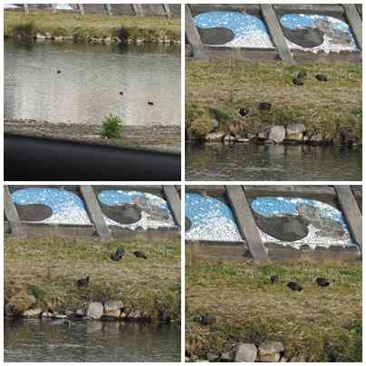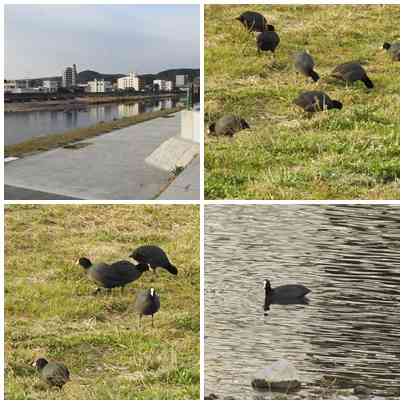 多治見橋下流右岸で朝ご飯を食べているオオバン。