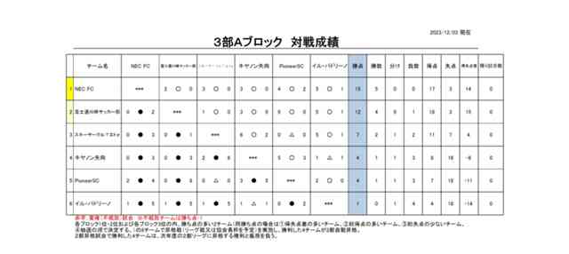 本日の試合をもちまして、3部Aブロックの全日程が終了いたしました。