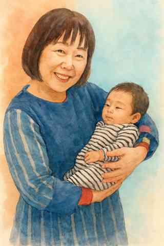 AIが写真をもとに作ってくれた水彩画載せるね。あまりにてないし、赤ちゃんも大きいけど、結構気に入りました。