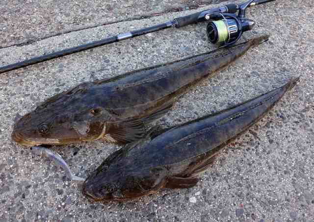 自作のヘッドとワームで探ると、3回アタって2尾のマゴチゲット!