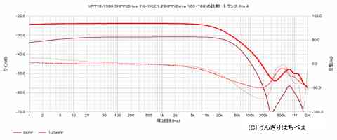 トランスの高域特性は、総漏れインダクタンスとトランスの容量のLCフィルタとなりますので、Cを大きくしても、LCフィルタは、-12dB/octで-180°位相がまわります。