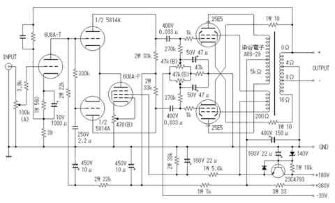 下のが上のアンプの回路なのですが、ラボの今年の企画として、この球に合うくらいの