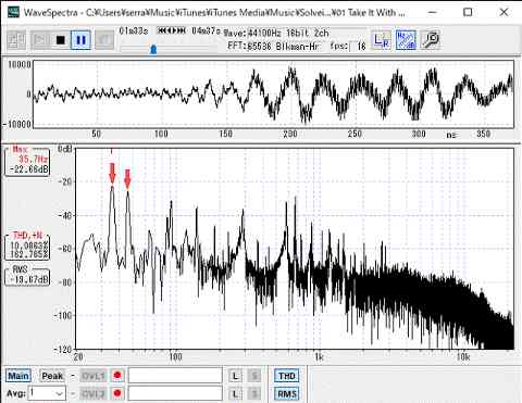 ミニオフ会での話題ですが、スールヴァイグ・シュレッタイェルのアルバムSilverより、 Take it with meの1分33秒前後に36Hzと46Hzの低音が連続して出てきます。 これを再生できるのはヘッドホン、スピーカーならサブウーハーでしょうか。 あるいはシングルアンプならトランスで歪んだ倍音が聞き取れるかもしれません。