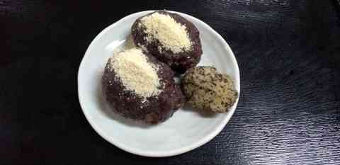 No.250ポール牧2022年10月4日 17:58 無農薬、無化学肥料で作った小豆と餅米のお萩です。きな粉をかけて頂きました。