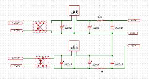 +電源用低雑音レギレータICを2個使用して+-電源を作ると図の様な感じかと思います。