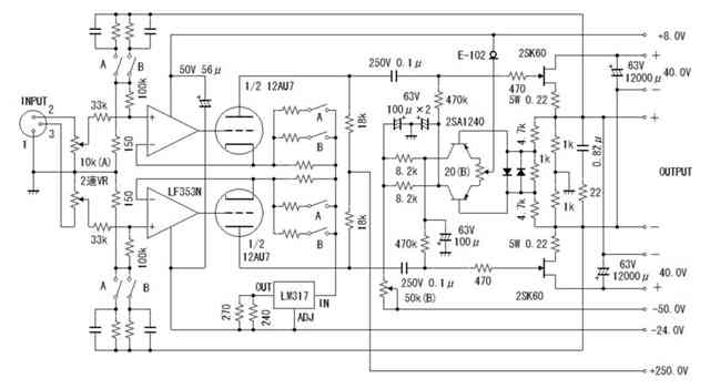 只今製作中のアンプは正にハイブリッドです。(回路図案参照)