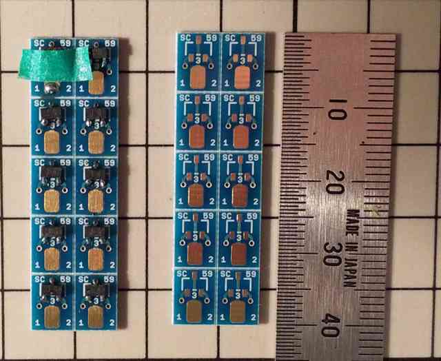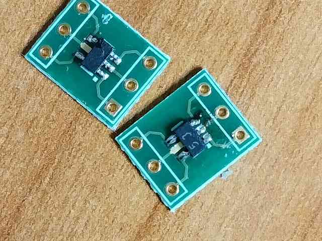 取り出したチップに小さく切ったマスキングテープを貼り、変換基板に止めてから3番(真ん中)をハンダ付けし、テープを剥がしても基板から剥がれないのを確認して両側の1番と2番をハンダ付けしました。