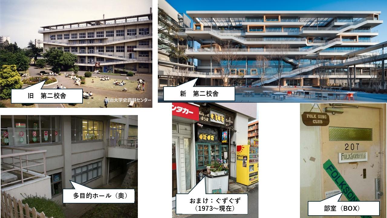 今も残っている多目的ホール、第二校舎、生まれ変わった第二校舎等の写真を添付します。