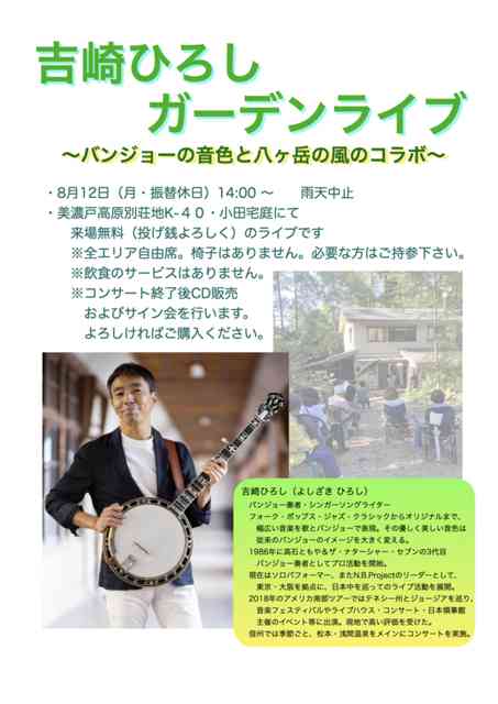 私の友人のプロ・バンジョー奏者・吉崎ひろしさんが、今年もやってきます。