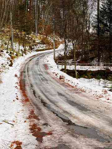 季節外れの雨で、砂利道はどこもツルツルです。