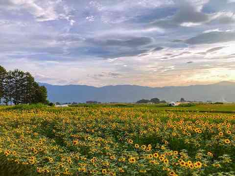 エコーラインの一番塚の信号をビーナスライン方面に行った左手(街側)のひまわり畑が満開です!ひまわり向こうには茅野の街と山々を見渡すことができ、なかなか「映える」景色です。
