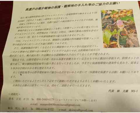 了解です。日程決まりましたらご連絡ください。先日数年ぶりに散歩がてら保護地を覗いてみました。あまりの草ぼうぼうというか荒れた保護地の感じでした。美濃戸は山野草の宝庫と言われ、まして保護地は希少植物となればほおっておくのは勿体ないです。チラシに寄れば管理会社が鹿よけの防護柵の手入れをしていただけるとの事嬉しいです。