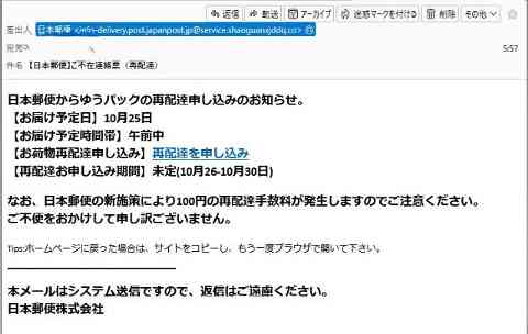 不在連絡票も入っていなかったし、再配達が有料化されたニュースも聞いていない、アドレスも怪しい。きっと詐欺ですね!