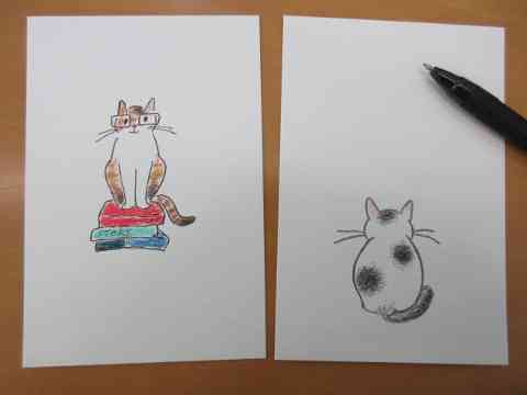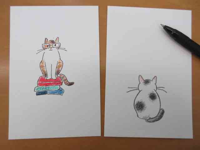 図書館にて模写遊び。倉敷マスキングテープ祭りでは、韓国から来た青年が「可愛い~」といって、お吟が猫の絵を模写したグリーティングカードを24枚も買ってくれたそうだ。猫の絵から売れてゆくというので、来年に向けて描き始める。日頃、有機農法の野菜料理をごちそうになっている茶房に、4000円くらいは支援できたかな(笑)。