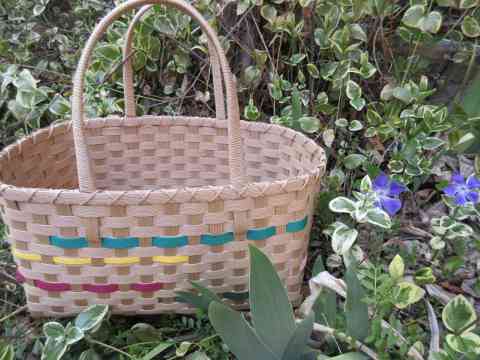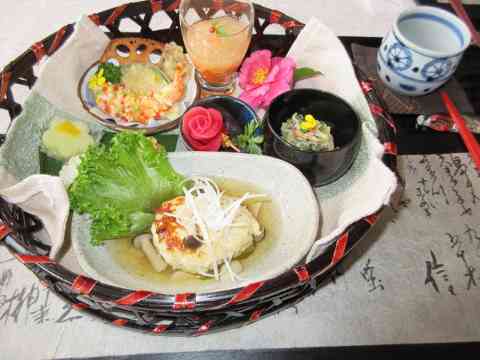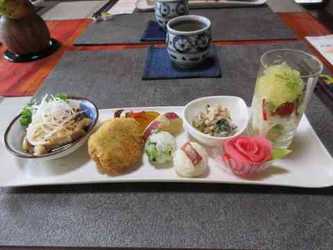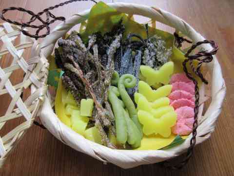 籠にお茶おにぎりお菓子花衣