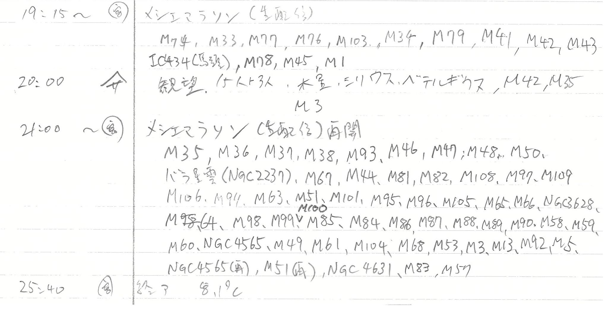 冬~春のメシエ天体+少し寄り道天体も網羅できましたので、「ハーフマラソン」といったところでしょうか。M57に向けたところでお開きとしました。自動導入と大型望遠鏡の効果は絶大で、透明度が悪かったにも関わらず、ハイペースで進めることができました。本来のメシエマラソンのだいご味が薄れているようにも感じましたが、撮影用にもう少し時間がとれたと反省しています。次回はもう少し余裕を持ったペース配分ができると思いました。