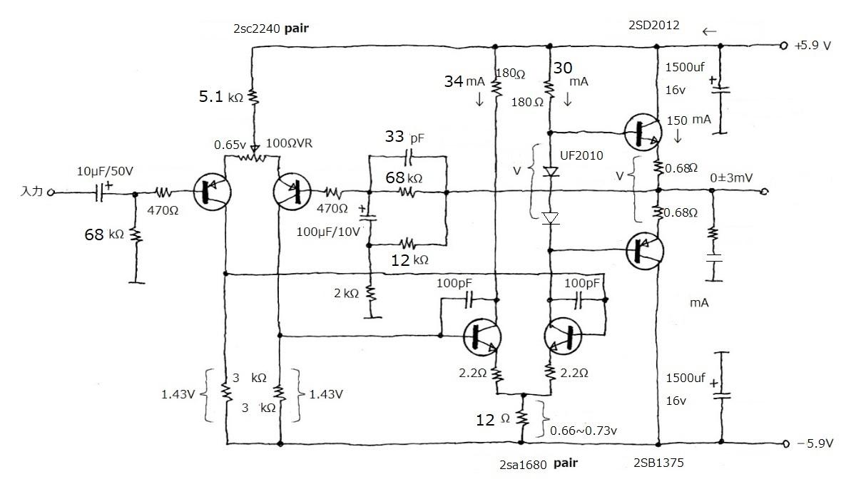 こんにちわ。ぺるけさんのトランジスタミニワッターversion5の初段をJfetから2sc2240バイポーラ差動に変えてしまいました。思いついて勢いで作ってしまいましたが、こんなことして大丈夫なのでしょうか。温度補償回路など必要になってくるのでしょうか?電圧測定と回路図添付いたします。(初段が2SC2240、次段が2SA1680です。図では逆になってすみません)