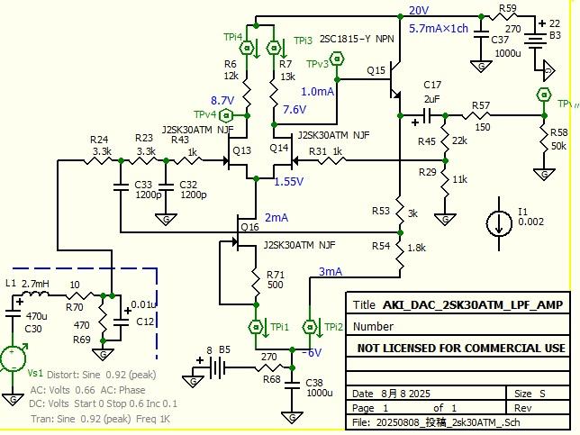 回路確認検討に使用している 5Spice Analysis 2.0 でのシミュレーション値では低めの6,7Vのほうが歪率が良好に