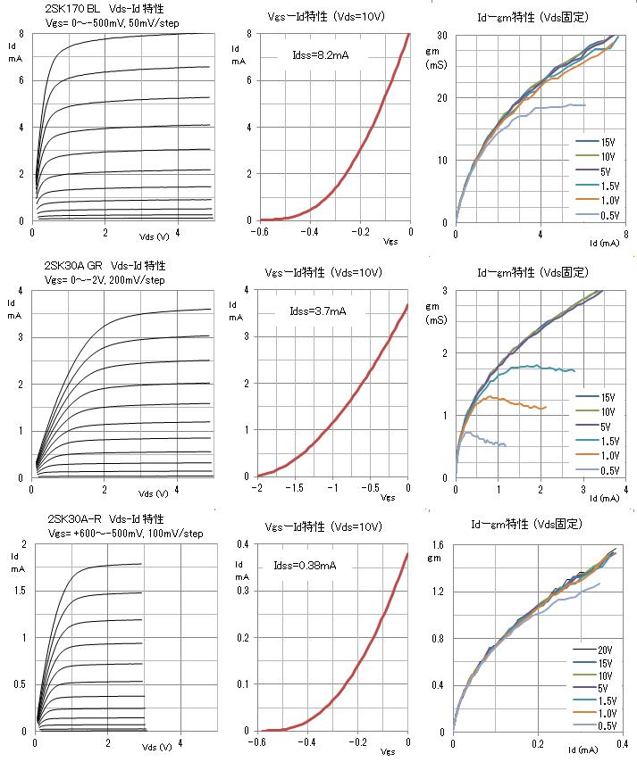 添付画像はK170-BL, K30A-GR, K30A-Rの実測データですが、K170は1.9mAでgm=16mS、K30Aは1mAでgm=1.8mSです。