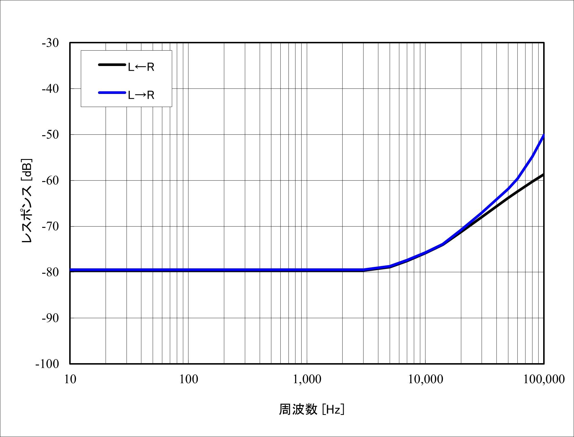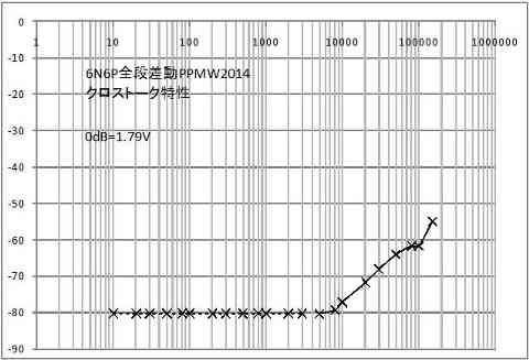 6N6Pミニワッター2014の解説の中に「高域の飛び付き」があると補足がされていたので、クロストークをとって見ました。(測定は、片方向のみ)20kHzで72dB が確保されているので、問題のない状態と判断しています。(8kHz以下は測定限界です)