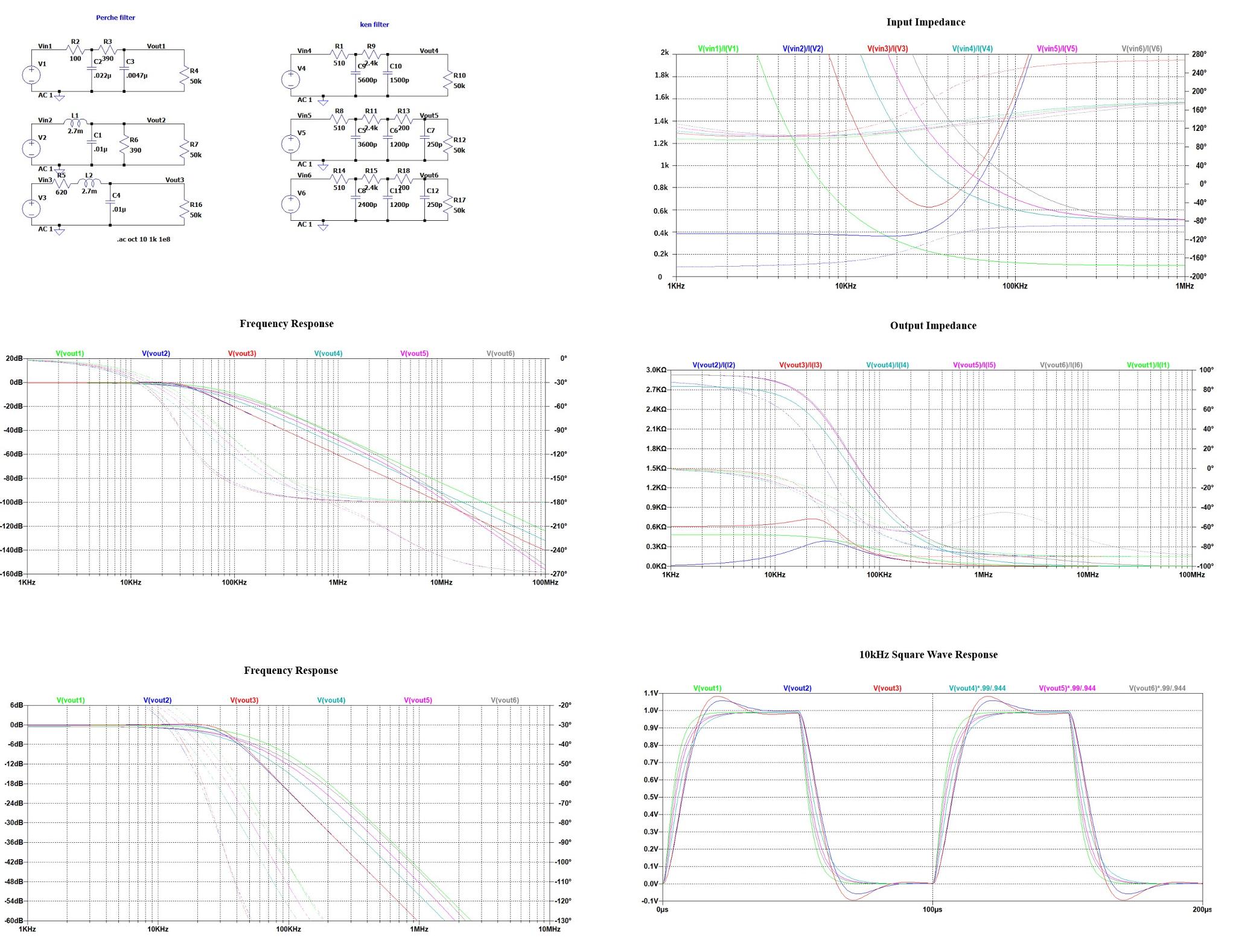 右中図は出力インピーダンスです。ぺるけさんのLPFはいずれも十分に低い値です。私のLPFは3kΩ近くあります。そのため出力側はシールド線が必要です。