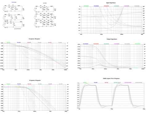 右下図は矩形波応答です。LC型LPFはいずれもオーバーシュートがあります。これは肩特性を平坦にした代償です。減衰振動には至っていませんが、半値幅を読取るとfcとほぼ一致します。つまり、入力信号とは無関係な成分です。可聴帯域以上ですから音質には影響しないとされています。
