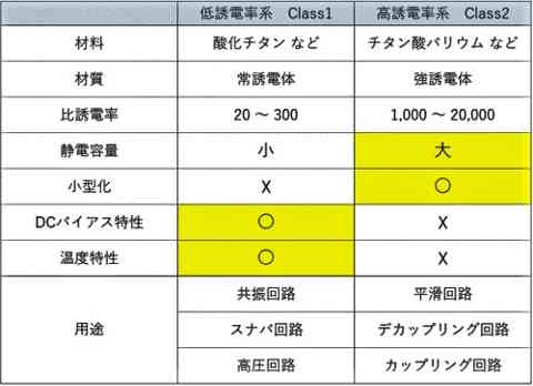 クロス中和に使えそうな数pF~数十pFの積層セラッミックコンデンサはC0G仕様のもののようですが、これは下表の低誘電率系Class1に属しています。C0Gは温度特性ですが、MIL規格の NP0、JIS規格のCGに相当するEIAの仕様です。C0Gのものは温度特性が優れていますが、電圧特性も優れているようです。