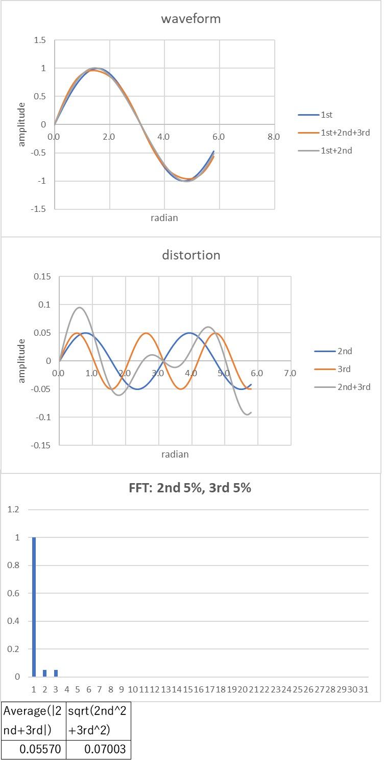 添付図の1番上は基本波に5%の2次歪と5%の3次歪を加えた波形をexcelで描いたものです、2番目の図は歪成分だけを描いたものです。基本波に5%の2次歪と5%の3次歪を加えた波形をFFTにかけたのが3番目の図です。2次歪、3次歪とも5%で、打ち消しは起こっていないことが分かります。